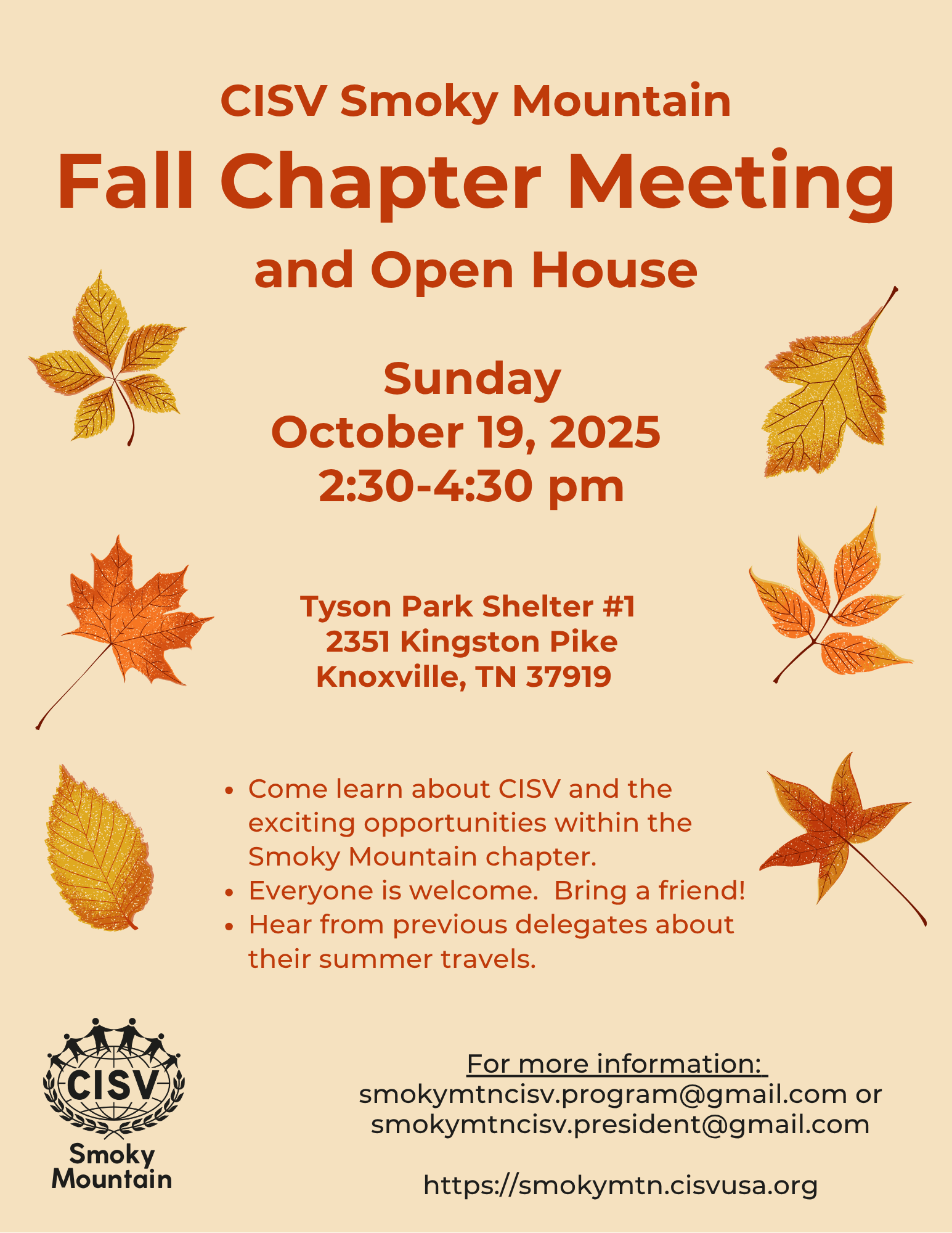 We will be meeting at Tyson Park (2351 Kingston Pike, Knoxville, TN 37919) at Shelter #1 from 2:30 pm – 4:30 pm on October 19. Board members, we will be voting on some changes to the bylaws so please try to be there. Bring your friends for our Open House to learn about CISV and exciting opportunities within the chapter.
